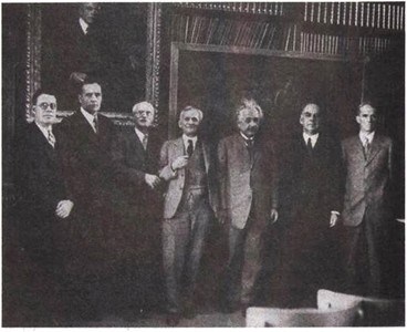 Рис. 21.13. Группа знаменитых ученых у портрета Дж. Хейла в 1931 году. Слева направо: М. Хьюмасон, Э. Хаббл, Ч. Сент-Джон, А. Майкельсон, А. Эйнштейн, У. Кэмпбелл и У. Адамс. Заметим, что Сент-Джон в 1922 году показал, что атмосфера Венеры почти лишена воды и кислорода. Адамс (директор обсерватории Маунт-Вилсон) доказал, что Сириус В — это белый карлик, а Кэмпбелл, глава Ликской обсерватории, был знаменитым специалистом по спектроскопии. С разрешения Библиотеки Хантингтона.