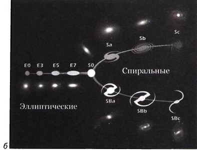 Эллиптические галактики (Е, от elliptical) выглядят как довольно однородные сферические или сплющенные пятнышки света, более яркие в центре и тускнеющие к краям. Степень их сферичности обозначается цифрами (Ео) — сферическая, (Е7) — очень сплюснутая. Спиральные галактики делятся на две группы: нормальные спирали (S) и спирали с перемычкой (SB, где В — от bar). У нормальных галактик спирали выходят из центра галактики, а у галактик с перемычкой они начинаются от концов перемычки. В зависимости от компактности спиралей, их делят еще и на подклассы Sa, Sb и Sc (а галактики с перемычкой — SBa и т. д.). Самые плотно закрученные спирали относятся к классу Sa, а самые рыхлые — к Sc. Хаббл выделил еще и промежуточный класс S0 (эс ноль); эти галактики такие же плоские, как спиральные, но при этом почти такие же гладкие, как эллиптические. Все эти типы представлены на «камертонной» диаграмме Хаббла (рис. 21.11).