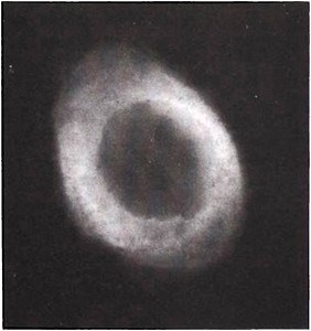 Вера Гершеля в теорию «островных вселенных» сильно пошатнулась в 1790 году. Он открыл туманность, которая не могла быть звездной системой, — «планетарную туманность», известную сегодня как NGC1514, где центральная звезда окружена газовым облаком (рис. 21.3). Если бы ее туманная часть действительно состояла из звезд, то по сравнению с ними центральная звезда должна была бы иметь огромную светимость. Если же в центре находится обычная звезда, то туманная часть должна состоять из невероятно маленьких звезд. Поэтому Гершель решил, что в данном случае туман — это реальное, а не кажущееся явление, обусловленное очень далекими и тесно расположенными звездами. С этого момента он уже не был уверен в природе любой другой «неразрешимой» туманности.