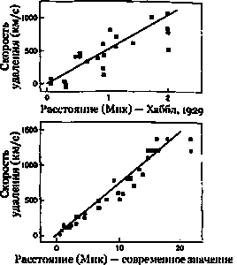 Рис. 21.14. Скорости удаления галактик и их расстояния. Точки представляют наблюдения конкретных галактик, а прямые линии — закон Хаббла. Верхняя диаграмма основана на работе Хаббла 1929 года, а внизу современная диаграмма Хаббла для того же интервала расстояний. Заметим, что современные значения расстояний почти в 10 раз больше значений, полученных Хабблом. Это связано с большой систематической ошибкой в старых измерениях.