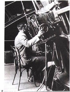 Рис. 21.11. (а) Эдвин Хаббл у телескопа, (б) «Камертонная» диаграмма Хаббла с фотографиями соответствующих типов галактик.