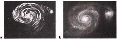 Этот гигант собирал гораздо больше света, чем телескопы Гершелей, и позволял более детально рассмотреть туманности. Одним из важнейших открытий Парсонса стала спиральная структура туманности М51, которую именно он увидел впервые. Уже вскоре после начала наблюдений на телескопе Парсонс докладывал, что он «очень четко видел спиральную форму основного ядра, а также спиральность меньшего ядра». Его рисунок туманности был продемонстрирован на собрании Британской ассоциации содействия развитию науки в Кембридже. Это стало сенсационной новостью, и с этого момента центр дискуссии сместился от вопроса «Можно ли разрешить туманности на звезды?» к вопросу об их форме. Вы можете сравнить современную фотографию М51 и рисунок Парсонса (рис. 21.5). За много лет до этого Джон Гершель смотрел на ту же туманность в свой 48-см телескоп, но смог разглядеть только «очень яркое круглое ядро, окруженное на некотором расстоянии туманным кольцом». Парсонс увидел «спиральность» и у других галактик; к 1850 году было известно уже 15 таких объектов, а к концу столетия эта цифра достигла тысячи. Спиральные туманности стали заметным компонентом Вселенной.