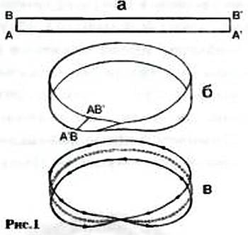 Между тем в 1858 году немецкий математик и геометр Август Фердинанд Мебиус (1790–1868) установил существование другого мира — одностороннего. Представление о нем можно получить, если соединить, сделав полуоборот, противоположные концы бумажной ленты. Полученное таким образом кольцо будет иметь лишь один край и одну сторону (см. рис. 1 а, б, в).