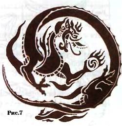 Чтобы не отвлекаться от избранной тематики, мы не будем дальше погружаться в глубины формирования китайской письменности и символики, стоящей почти за каждым ее знаком. Что же касается показанных изображений, то они имели свое развитие, трансформировавшись в облик дракона, кусающего собственный хвост (см. рис. 7).