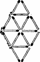 2. Уберите как можно меньше спичек так, чтобы оставшиеся спички образовали 4 равносторонних треугольника таких же размеров, как и 8 треугольников в исходной конфигурации, и нигде не торчали свободные концы.