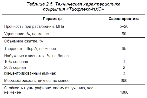 Эти составы предназначены для создания газо- и гидроизоляционных, антикоррозионных, химически стойких покрытий изделий и конструкций из железобетона и металла. Испытания показали, что покрытия этой группы пригодны к эксплуатации на воздухе, под землей, в воде, топливе, масле, нефти, органических растворителях, слабых растворах кислот и щелочей и в условиях действия повышенного ультрафиолетового излучения. Температурный интервал эксплуатации от -60 до +130 °C (табл. 2.5).