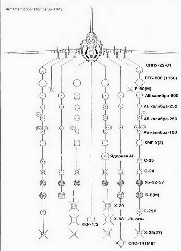 Максимальная боевая нагрузка Су-17МЗ —до 4000 кг при различных вариантах вооружения.