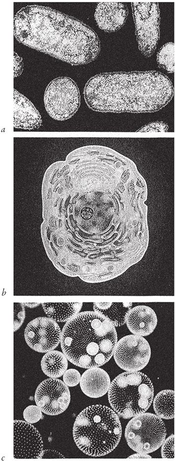 Строение древних копирующих механизмов – первых роботов-мультипликаторов – должно было быть гораздо проще, чем строение бактерий, но бактерии – это самые простые среди известных нам ТРКП-роботов (рис. 9.3а). У бактерий могут быть самые разные источники жизнеобеспечения, с химической точки зрения их намного больше, чем у всех остальных живых существ вместе взятых. Некоторые бактерии ближе к нам, чем к другим, чужеродным для них бактериям. Одни бактерии живут в горячих источниках и питаются серой, для других кислород – смертельный яд, третьи расщепляют сахар до спирта в отсутствие кислорода, четвертые питаются только углекислым газом и водородом, выделяя метан; фотосинтезирующие бактерии подобно растениям черпают жизненные силы в солнечном свете, но среди них есть и такие, которые осуществляют фотосинтез по совершенно другому механизму, чем растения. Разные группы бактерий демонстрируют широкий спектр вариантов биохимии, настолько радикально отличающихся друг от друга, что на их фоне все остальные – животные, растения, грибы, кое?какие другие бактерии – выглядят как безликая серая масса.