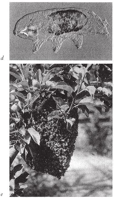 Рис. 9.3. Повышение уровня организации в живой природе: (а) одиночные бактерии; (b) следующая ступень – эукариотическая клетка с ядром, образовавшаяся на основе бактериального эндосимбиоза; (с) вольвокс – колония дифференцированных эукариотических клеток; (d) более плотное и более массовое скопление дифференцированных клеток – тихоходка; организм человека – тоже колония, колония колоний, так как каждая наша клетка представляет собой колонию бактерий[29]; (е) колония индивидуальных организмов, пчелиный рой – колония колоний колоний.