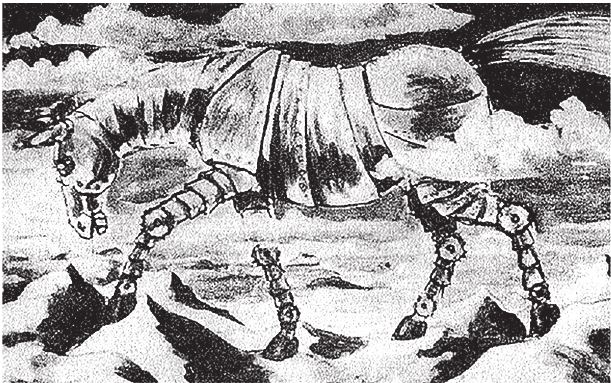 Рис. 9.4. Лошадь – это транспортный робот для молекул ДНК, по сравнению с ними она ужасно огромная. Если бы люди сконструировали для себя робота-коня, чтобы ехать в нем, как в Троянском коне, Гималаи поместились бы у него между ног. Эту фантастическую картинку нарисовала моя мама, Джин Докинз, для одной из моих рождественских лекций, которые я читал в Королевском институте.