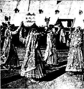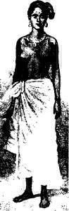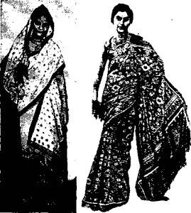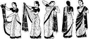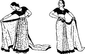 Сари — основа женского костюма в Индии. В древности, как об этом говорят храмовые фризы и изваяния, а также не изменявшаяся в течение многих веков одежда профессиональных танцовщиц южноиндийских храмов — исполнительниц древнейших форм танца, — сари состояло из двух частей длинного широкого полотнища, которым женщины искусно драпировали ноги, наподобие шаровар, выпуская спереди из-под пояса один его конец, заложенный в меткую складку, и шарфа, или покрывала, которым они или прикрывали плечи и грудь, а иногда и волосы, или стягивали только грудь, то навязывая его на спине, то пропуская его концы под пояс, то просто набрасывая на себя, все это в соответствии с обстоятельствами. А обстоятельства могли, да и сейчас могут быть, разными — присутствие мужчин или старших родственников, выход на улицу, участие в религиозных церемониях и процессиях, прием гостей и т. д.