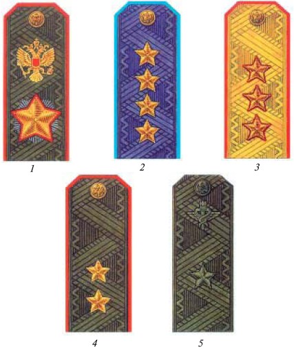 Погоны высших офицеров (кроме ВМФ): 1 – Маршал Российской Федерации (повседневная форма одежды); 2 – генерал армии (повседневная форма одежды, ВВС); 3 – генерал-полковник (парадная форма одежды); 4 – генерал-лейтенант (повседневная форма одежды); 5 – генерал-майор (полевая форма одежды)