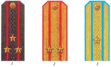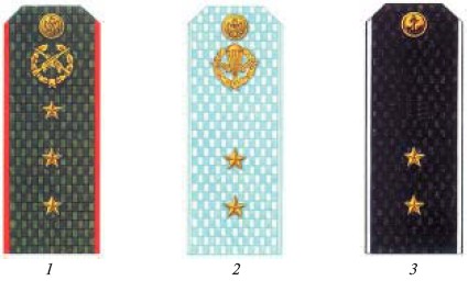 Погоны младших офицеров (кроме ВМФ): 1 – капитан (повседневная форма одежды); 2 – старший лейтенант (парадная форма одежды, ВВС); 3 – лейтенант (парадная форма одежды)