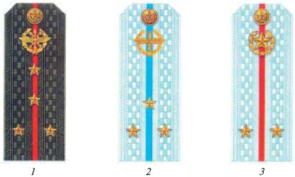 Погоны старших офицеров (кроме ВМФ): 1 – полковник (повседневная форма одежды); 2 – подполковник (парадная форма одежды); 3 – майор (парадная форма одежды, ВВС, ВДВ)