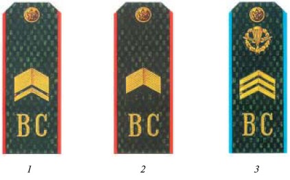Погоны сержантов и солдат (кроме ВМФ): 1 – младший сержант; 2 – ефрейтор; 3 – рядовой