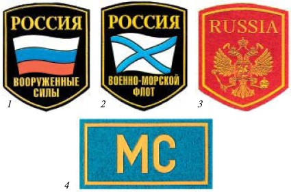 Нарукавные знаки различия по принадлежности к Вооруженным Силам: 1 – Вооруженные Силы (кроме ВМФ); 2 – Вооруженные Силы (ВМФ); 3 – военные представители в зарубежных странах; 4 – специальный контингент в составе ВС для участия в миротворческой деятельности