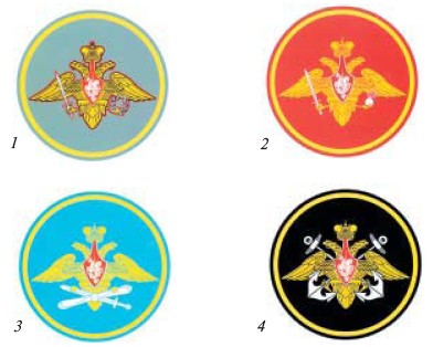 Нарукавные знаки различия по принадлежности к видам Вооруженных Сил: 1 – центральный аппарат Министерства обороны; 2 – Сухопутные войска; 3 – Военно-Воздушные Силы; 4 – Военно-Морской Флот