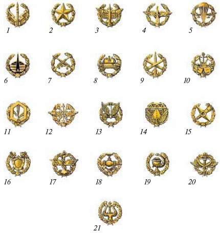Эмблемы видов, родов войск и служб Вооруженных Сил Российской Федерации: 1 – Ракетные войска стратегического назначения; 2 – Сухопутные войска; 3 – Войска ПВО; 4 – Военно-Воздушные Силы; 5 – Воздушно-десантные войска; 6 – Космические войска; 7 – мотострелковые войска; 8 – танковые войска; 9 – ракетные войска и артиллерия; 10 – инженерные войска; 11 – войска радиационной, химической и биологической защиты; 12 – войска связи; 13 – автомобильные войска; 14 – дорожные войска; 15 – топографическая служба; 16 – юридическая служба; 17 – служба военных сообщений; 18 – служба горючего и смазочных материалов; 19 – медицинская служба; 20 – ветеринарно-санитарная служба; 21 – военно-оркестровая служба