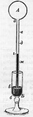 О расширении тел от теплоты знали уже древние греки, но применить это к измерению температуры воздуха и других тел догадался впервые только Галилей. Прибор его состоял из стеклянного шара С с тонкой трубкой, которая вставлялась шаром вверх в сосуд В, наполненный жидкостью. Перед тем как вставить трубку, шарик слегка нагревался, так что часть воздуха выходила из трубки. Если теперь внести прибор в более холодное помещение, воздух в шаре сожмется и жидкость в трубке поднимется до более высокого уровня г; если, напротив, станет теплее, воздух в шаре расширится и уровень жидкости в трубке опустится.