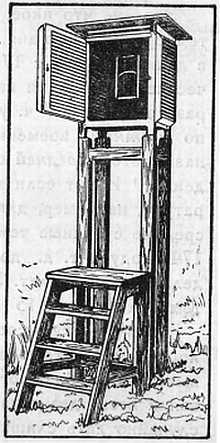 Для общежития это не имеет большого значения: нам бывает важно знать, тепло или холодно на улице, в каком платье выходить и т. д.; разница в 2°— 3° не играет здесь роли. Но для измерений научных и точных это уже не годится. Если, например, надо сравнить температуру в двух различных местах, нам важно, чтоб тут и там она измерялась в одинаковых условиях, иначе мы не узнаем, чему приписать разницу в температурах. Точность метеорологических измерений доходит до десятой доли градуса. Поэтому принято, чтобы всюду, где температура измеряется для научных целей, термометры помещались определенным образом. Их помещают в особые деревянные будки с дверцами, открывающимися на север. Стенки будок делаются в виде жалюзи и красятся белой краской; в них может свободно проходить воздух, но солнце не может непосредственно нагревать ни термометр, ни будку. Термометр в будке должен находиться на высоте двух метров от земной поверхности.