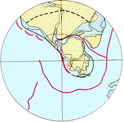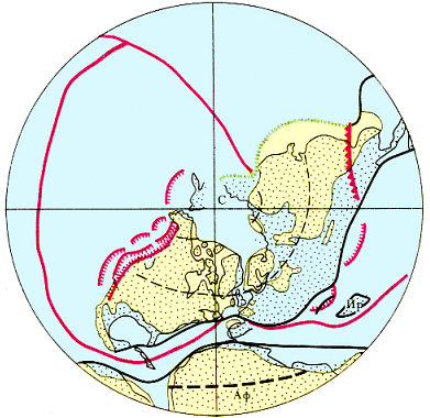 Положение литосферных плит и срединно-океанических хребтов в позднеюрской эпохе.