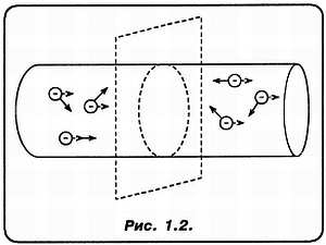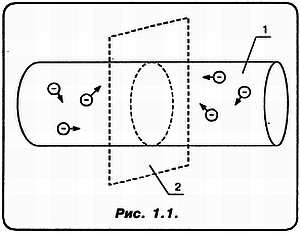 «А»: Все правильно, но ведь я спрашивал, Незнайкин, об электрическом токе! А нюанс здесь такой… Электроны, действительно, беспорядочно движутся внутри кристалла. И скорость их довольно велика. Она зависит, в значительной степени от температуры кристалла. При комнатной температуре средняя скорость электронов составляет несколько метров в секунду! Но представим себе некий кусок металла в виде отрезка проволоки, например, медной… Впрочем, давай лучше изобразим это на рисунке (рис. 1.1). Смотри, Незнайкин, мы как бы условно рассекли отрезок медной проволоки (1) плоскостью, которую я обозначил, как (2)…