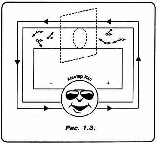 «А»: А именно в том, что «Мистер Икс» обеспечивает нам возможность, а значит и право, пририсовывать к электронам пунктирные стрелки. Иначе говоря, «Мистер Икс» является той СИЛОЙ, тем самым источником, которая ГЕНЕРИРУЕТ ТОК в проводнике! Не зря я пририсовал слева от него МИНУС, а справа ПЛЮС!