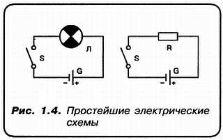 «А»: Да, но для этого совершенно необязательно заканчивать художественный институт! Весь мир уже много десятилетий как изображает электротехнические цепи любой сложности с помощью условных обозначений! Вот я зарисовал несколько простейших цепей. Смотри (рис. 1.4)!