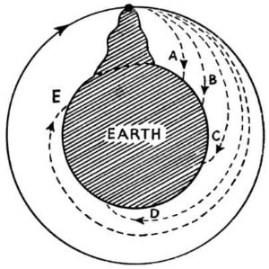 Если снаряд выстрелить с вершины горы, тогда прямолинейная траектория его полета будет скривлено земным притяжением. В зависимости от приданной ему начальной скорости, снаряд станет перемещаться по кривым А, В, С , D или Е. Если начальная скорость превысит некое критическое значение, тогда снаряд очертит круг и ли эллипс, "и возвратится к той горе, с которой его выстрелили". Более того, согласно второму закону Кеплера, "его скорость после возврата будет не меньшей, чем вначале, а при сохранении той же скорости он будет все время вычерчивать ту же самую кривую, в соответствии с тем же законом (…) и кружить по небу точно так же, как планеты по своим орбитам". Иными словами, в своем умственном эксперименте Ньютон создал искусственный спутник, почти что за три сотни лет до того, как техника была способна реализовать эту идею.