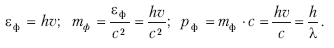 Согласно квантовой теории света А. Эйнштейна, волновые характеристики фотонов света (частота колебаний v и длина волна л = c/v) связаны с корпускулярными характеристиками (энергией ?ф, релятивистской массой mф и импульсом рф) соотношениями: