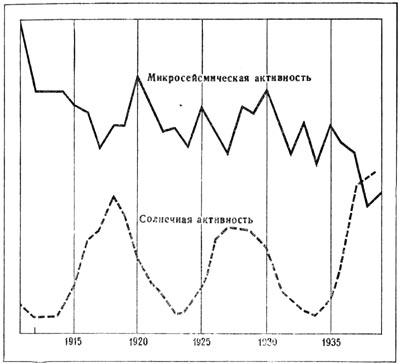 Рис. 23. Сопоставление микросейсмической и солнечной активности.