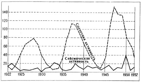 Перенесем на график кривую сейсмической энергии с рис. 11 (по данным Гутенберга и Рихтера) и вычертим кривую солнечной активности, измеренную Вольфовыми числами. Мы получим тогда график, представленный на рис. 24, где кривая сейсмической активности вычерчена сплошной линией, а солнечной активности — штрихами. Хотя здесь сходство между кривыми менее отчетливо, чем на рис. 23, но все же оно имеется. Заметно отставание на несколько лет соответствующих фаз сейсмической активности от солнечной. Поэтому максимум сейсмической активности почти совпадает с минимумом солнечной. Это совпадение особенно бросается в глаза в отношении 1923 года. Думается, максимум солнечной активности, достигшей в 1957 году исключительной интенсивности, не случайно опережает на три года сейсмический максимум 1960 года, тоже крайне необычного.