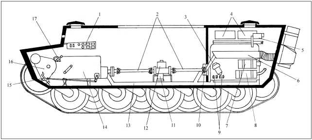 Компоновка корпуса (продольный разрез): 1 — панель приборов; 2 — карданные валы; 3 — масляный фильтр; 4 — воздушные фильтры; 5 — магнето; 6 — выхлопной коллектор; 7 — генератор; 8 — масляный радиатор; 9 — топливные насосы; 10 — нагнетатель воздуха; 11 — водооткачивающий насос; 12 — привод механизма поворота башни; 13 — труба подачи воздуха; 14 — коробка передач; 15 — педаль главного фрикциона; 16 — механизм поворота; 17 — рычаг переключения передач.