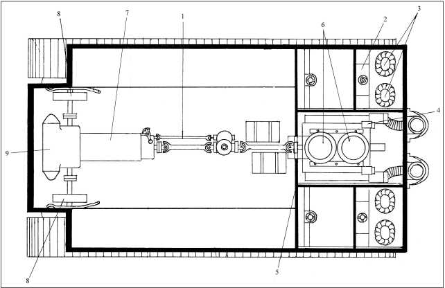 Компоновка корпуса (план): 1 — вал отбора мощности к механизму поворота башни и водооткачивающему насосу; 2 — радиатор; 3 — вентиляторы; 4 — магнето; 5 — огнеупорная перегородка; 6 — воздушные фильтры; 7 — коробка передач; 8 — тормоза; 9 — механизм поворота.