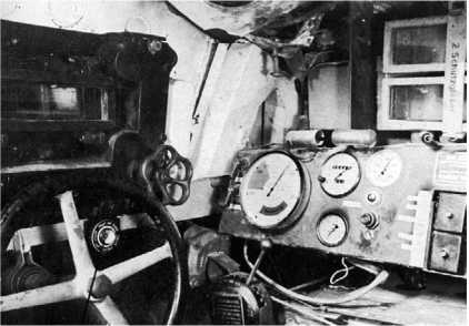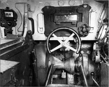 Фото вверху — вид на место механика-водителя. Управление танком осуществлялось с помощью штурвала. Характерной формы вентиль рядом с прибором наблюдения предназначен для подъема и опускания броневой заслонки. Фото внизу — так выглядела панель приборов танка «Тигр». Справа от штурвала — рычажок переключения передач.