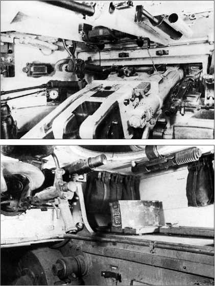 Интерьер боевого отделения. Слева от казенной части пушки установлен телескопический прицел TZF-9a, справа — спаренный пулемет (фото вверху). Вид на установку курсового пулемета (фото внизу).