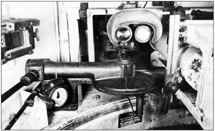 Место наводчика танка «Тигр». На переднем плане — механизм ручного привода поворота башни, над ним — окуляры бинокулярного прицела TZF-9а.