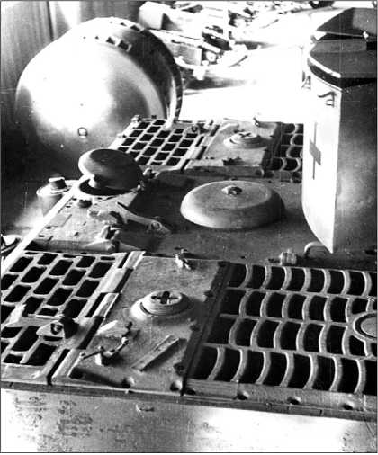Крыша корпуса: 1 — карман воздухопритока к двигателю; 2 — броневой колпак над окном воздухооттока; 3 — антенна; 4 — лючок над заливной горловиной правого топливного бака; 5 — решетки над окнами воздухопритоков к радиатору; 6 — лючок над предохранительным клапаном системы охлаждения; 7 — решетки над окнами воздухооттока; 8 — откидная крышка над лючком для монтажа трубы ОПВТ; 9 — лючок над заливной горловиной системы охлаждения; 10 — лючок над заливной горловиной левого топливного бака.