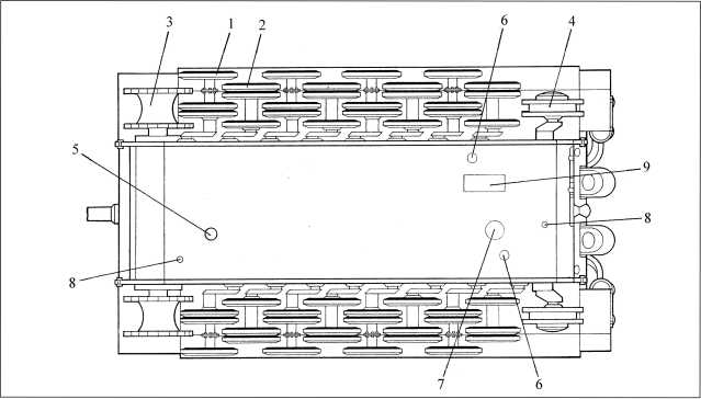 Схема ходовой части и днища танка: 1, 2- опорные катки; 3 — ведущее колесо; 4 — направляющее колесо; 5 — люк для слива масла из коробки передач; 6 — лючки для слива топлива; 7 — лючок для слива воды и моторного масла; 8 — днищевые вентили; 9 — люк для доступа к генератору и топливному насосу.