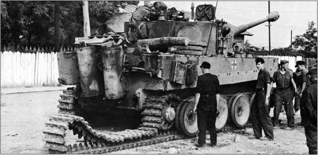 Демонтаж транспортной гусеницы с одного из танков «Тигр» моторизованной дивизии «Великая Германия». Август 1944 года.
