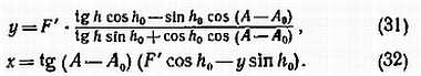 Роль «азимута» будет играть угол ζ роль «высоты» — угол η. На снимке мы с помощью прямоугольной прозрачной палетки или измерительного прибора измеряем прямоугольные координаты деталей х, y отсчитываемые от найденного нами центра снимка. Если координаты приходится отсчитывать от другого начала (обозначим их х', у'), то нужные нам координаты х, у мы найдем по формулам