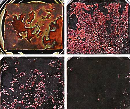 После этого выключите нагрев и подождите, пока пластина остынет до комнатной температуры. Остывая, металл, как известно, сжимается. А поскольку коэффициенты сжатия меди и ее окислов отличаются, то черные хлопья начнут отслаиваться, обнажая нижележащий слой.