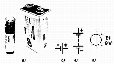 На УГО (условно-графических обозначениях) ХИТ, как правило, показывают полярность выводов (см. рис. 1, б, в). На конкретных схемах в программе EWB указывают рядом с ним позиционное обозначение компонента и величину ЭДС, например Е1 = 9 В (см. рис. 1, г).