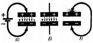 Если источник тока отключить от конденсатора, то конденсатор окажется заряженным (рис. 39, б). Переходу избыточных электронов с одной обкладки на другую препятствует диэлектрик. Между обкладками конденсатора тока не будет, а накопленная им электрическая энергия будет сосредоточена в электрическом поле диэлектрика. Но стоит обкладки заряженного конденсатора соединить каким-либо проводником (рис. 39, в), «лишние» электроны отрицательно заряженной обкладки перейдут по этому проводнику на другую обкладку, где их недостает, и конденсатор разрядится. В этом случае в образовавшейся цепи также возникает кратковременный ток, называемый током разрядки конденсатора. Если емкость конденсатора большая, и он заряжен до значительного напряжения, момент его разрядки сопровождается появлением значительной искры и треска.