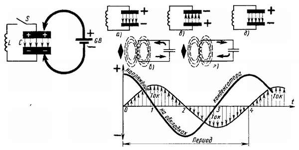 В момент замыкания контура выключателем верхняя обкладка конденсатора имеет положительный заряд, а нижняя — отрицательный (рис. 40, а). В это время (точка 0 на графике) тока в контуре нет, а вся энергия, накопленная конденсатором, сосредоточена в электрическом поле его диэлектрика. При замыкании конденсатора на катушку конденсатор начнет разряжаться. В катушке появляется ток, а вокруг ее витков — магнитное поле. К моменту полной разрядки конденсатора (рис. 40, б), отмеченному на графике цифрой 1, когда напряжение на его обкладках уменьшится до нуля, ток в катушке и энергия магнитного поля достигнут наибольших значений. Казалось бы, что в этот момент ток в контуре должен был прекратиться. Этого, однако, не произойдет, так как от действия ЭДС самоиндукции, стремящейся поддержать ток, движение электронов в контуре будет продолжаться. Но только до тех пор, пока не израсходуется вся энергия магнитного поля. В катушке в это время будет течь убывающий по значению, но первоначального направления индуцированный ток.
