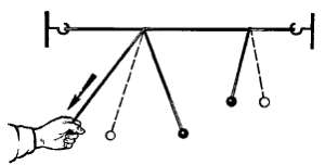 Перекинь через веревку еще один такой же маятник, но с более длинной ниткой. Длину подвески этого маятника можно изменять, подтягивая рукой свободный конец нитки. Приведи маятник в колебательное движение. При этом первый маятник тоже станет колебаться, но с меньшей амплитудой. Не останавливая колебаний второго маятника, постепенно уменьшай длину его подвески — амплитуда колебаний первого маятника будет увеличиваться. В этом опыте, иллюстрирующем резонанс механических колебаний, первый маятник является приемником колебаний, возбуждаемых вторым маятником. Причиной, вынуждающей первый маятник колебаться, являются периодические колебания растяжки с частотой, равной частоте колебаний второго маятника. Вынужденные колебания первого маятника будут иметь максимальную амплитуду лишь тогда, когда его собственная частота совпадает с частотой колебаний второго.