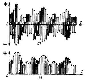 Под действием радиоволн в контуре приемника возбуждаются модулированные колебания радиочастоты (рис. 45, а). К контуру подключена цепь, состоящая из диода и телефонов. Для этой цепи колебательный контур является источником переменного тока радиочастоты. Поскольку диод пропускает ток только одного направления, то модулированные колебания радиочастоты, поступающие в его цепь, будут им выпрямлены (рис. 45, б), или, говоря иначе, продетектированы. Если провести штриховую линию, огибающую вершины выпрямленного тока, то получится «рисунок» тока звуковой частоты, которым модулирован ток, поступающий в антенну радиостанции во время передачи.