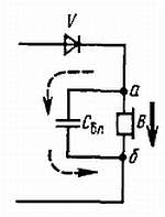 Электрическая емкость блокировочного конденсатора такова, что через него свободно проходят токи высокой частоты, а токам звуковой частоты он оказывает значительное сопротивление. Телефоны, наоборот, хорошо пропускают токи звуковой частоты и оказывают большое сопротивление токам высокой частоты. На этом участке детекторной цепи высокочастотный пульсирующий ток разделяется (на рис. 48 — в точке а) на составляющие, которые далее идут: высокочастотная через блокировочный конденсатор Сбл, а составляющая звуковой частоты — через телефоны В. Затем составляющие соединяются (на рис. 48 — в точке б) и далее опять идут вместе.