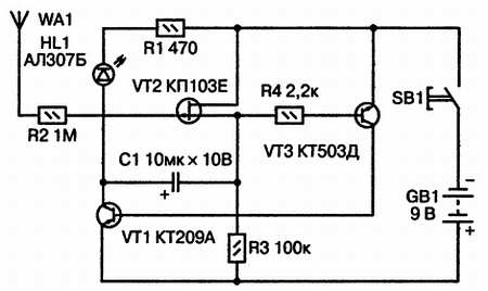 На комплементарной паре транзисторов VT1 и VT3 собран импульсный генератор, который после подачи питания тумблером SB1 заперт благодаря открытому состоянию транзистора VT2. Но если на затвор этого транзистора поступит наводка от близко расположенных проводов электросети, он запрется и генератор начнет работать. В результате начнутся вспышки светодиода HL1. Питание схемы осуществляется от батареи «Крона» напряжением 9 В.