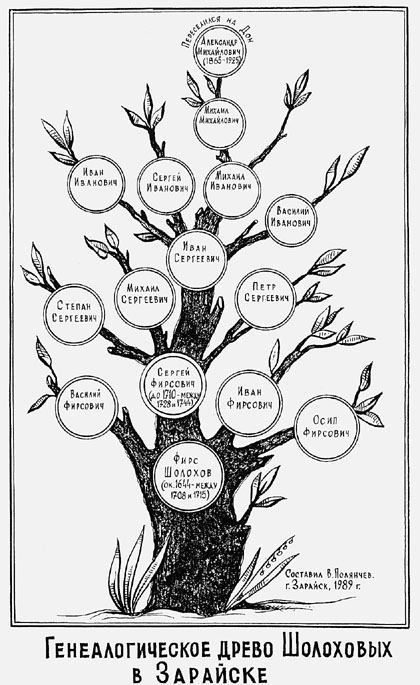 Генеалогическое древо Шолоховых в Зарайске. Составил краевед В. Полянчев,г. Зарайск Московской области, 1989 г.